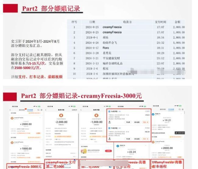 其中,8月25日打網約車到深業有居金三角店進行嫖娼,支付creamyFreesia賬戶3000元。 PPT內附有截圖證明10次嫖娼金額為30330元,每次費用在2000元至5000元不等。