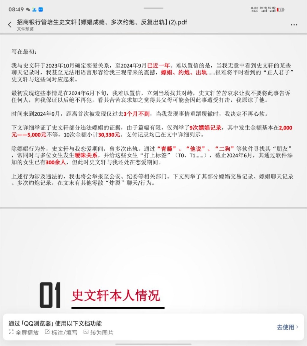 深圳有女網民制作一份達58頁的PPT,指控在招商銀行當管培生的男朋友出軌,與多名女性約炮、嫖娼等,還列出大量男友的聊天紀錄及嫖資證明。 涉事男子雖曾下跪道歉,哀求不要舉報,但仍未能阻止女友在網上施放核彈級爆料。 涉事銀行指會核實事件并作調查。