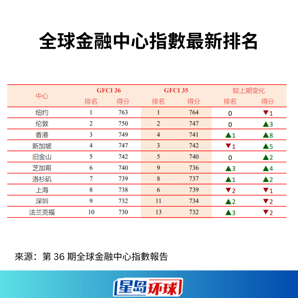 國際金融中心秩序再現“紐倫港”,由英國智庫Z/Yen與中國綜合開發研究院共同編制的全球金融中心指數(GFCI),香港排名相隔兩年重新超越新加坡,排名第3,得分亦明顯提升。