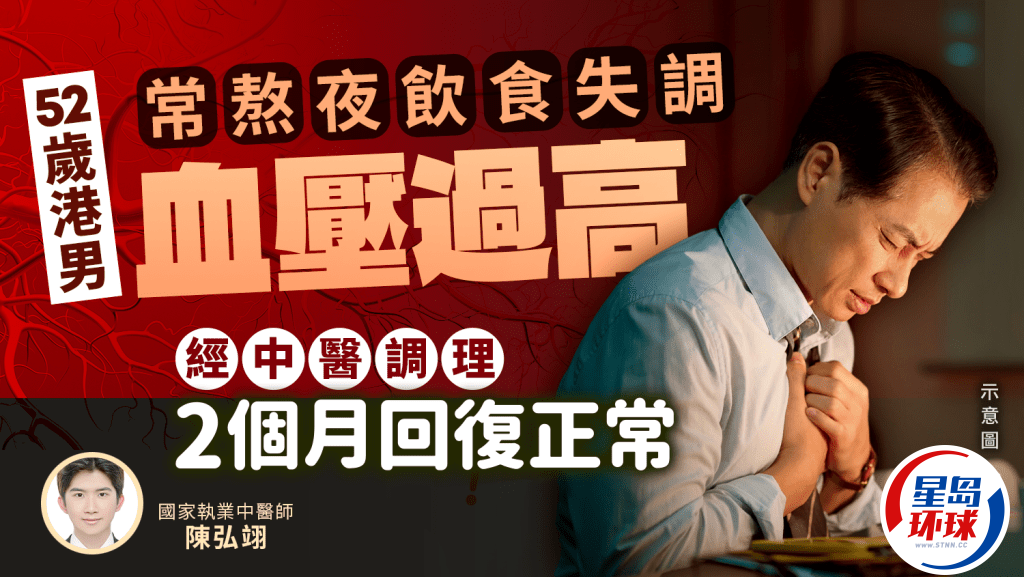 52歲港人謝先生長期身處北京,須與國外客戶接洽工作,因而經常在凌晨開會,日夜顛倒,更有失眠疲乏、飲食失調和過量等情況。 在恒常身體檢查的時候,發現血壓達到180/120mmHg。 西醫建議他先通過調整生活模式幫助降低血壓,若仍然無法達到目標,則需要長期服用降壓藥。