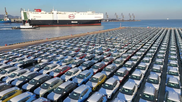 ▲山東煙臺港的比亞迪貨船和準備出口的電動車。(中新社)