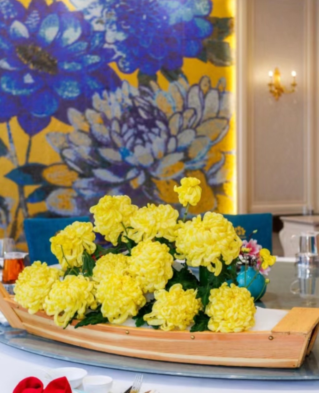 ▲時代花城必吃網紅打卡菊花刺身,菊花現點現摘,以日式刺身船承載,造型華麗吸睛。 (圖片來源:小紅書@秦觴)
