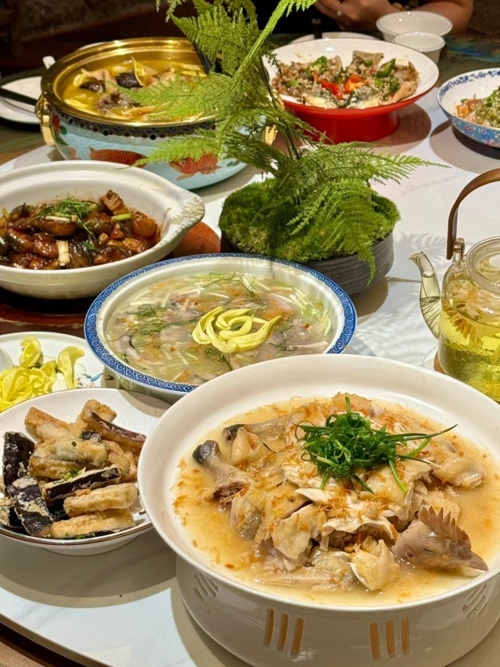 香山家宴在AAA荔景苑景區內,開業7年,2021年獲得“中國餐廳金獎”,佔地30畝,典型嶺南園林設計,有棵800年歷史老荔枝樹、荷花池、魚池喂錦鯉,是旅游打卡好去處。菊花菜式有涼拌菊花,加入香蕉、花生、白糖和沙律醬,爽口清甜,對香港人來說頗為新奇;菊花水欖是小欖特色小吃,有點像湯圓;點心拼盤有菊花點心,軟糯可口。其他傳統地道美食有小欖炸魚球、大煎堆、烤乳鴿、姜蔥紫蘇豆豉炒脆肉鯇、南頭銅盤蒸雞等。