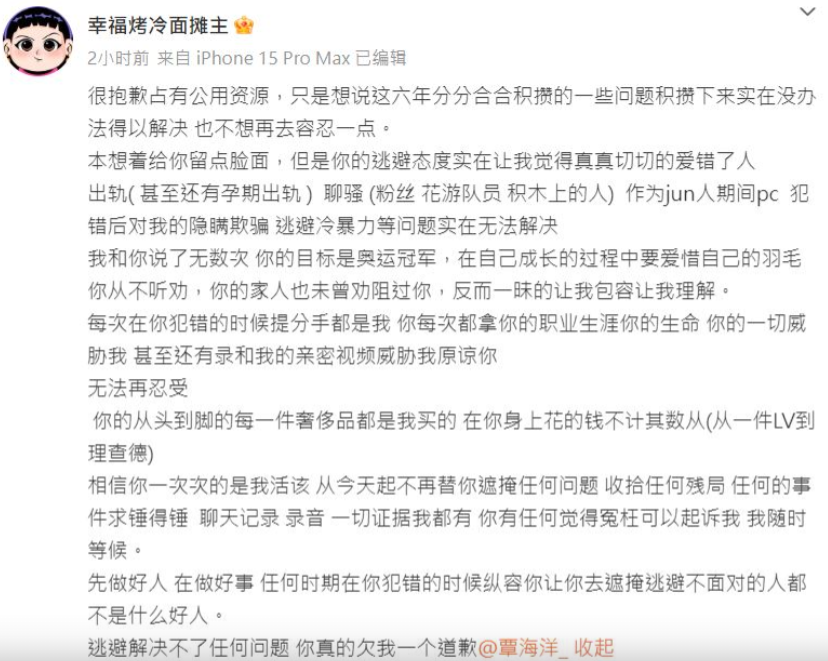 ▲未婚妻在社交平臺列出覃海洋的指控。微博