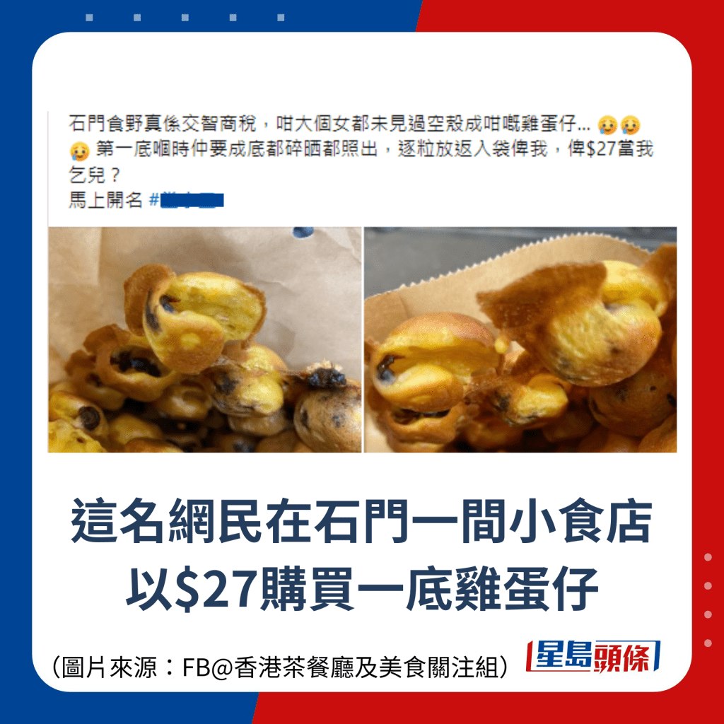 日前,有網民于社交平臺Facebook“香港茶餐廳及美食關注組”群組發文,分享自己購買到“空殼”雞蛋仔的中伏經歷。事緣,這名網民在石門一間小食店以$27購買雞蛋仔。但事主對于雞蛋仔的質素并不感到滿意,直指“咁大個女都未見過空殼成咁嘅雞蛋仔”,更表示“石門食野(嘢)真系交智商稅”。從事主上載的圖中所見,并非每粒雞蛋仔都呈漲卜卜的圓形形狀。事主更表示收到雞蛋仔時,“成底都碎曬都照出(整個底都碎了都照出)”,店員逐粒雞蛋仔放回紙袋內,令事主非常不滿。