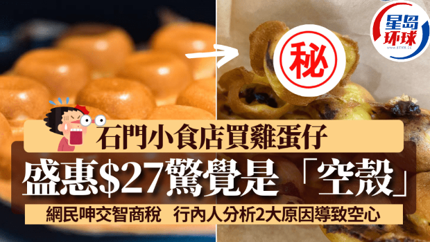 雞蛋仔是香港獨特的街頭美食,日常行經小食店,都不難發現雞蛋仔的蹤影。每逢到下午茶時段,吃雞蛋仔當作輕食“過口癮”之余又飽肚。不過,不同小食店出品的雞蛋仔款式及口味都略有不同,質素相當參差!近日就有網民在石門購買雞蛋仔后,驚覺雞蛋仔竟然是“空殼”,在社交平臺大呻尤如交智商稅!