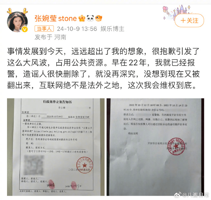 隨著于正官宣新簽約藝人消息的持續發酵,有網友扒出張婉瑩在2022年走紅時,曾被爆出“當小三”等負面信息。據頂端新聞,知情人士表示“當年第一時間就已向當地派出所報了警,警方核實了這個事情,是不實的,也處理了,具體情況需要向警方了解?!睆埻瘳撈浜笤谏缃幻襟w亦公開回應稱,早在2022年,我就已經報警,造謠人很快刪除了(貼文),就沒再深究,沒想到現在又被翻出來,互聯網絕不是法外之地,這次我會維權到底。 ”