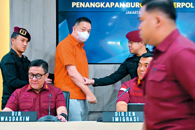 ▲印尼當局10日召開記者會,宣布被中國通緝的林強(橙衣者)落網。