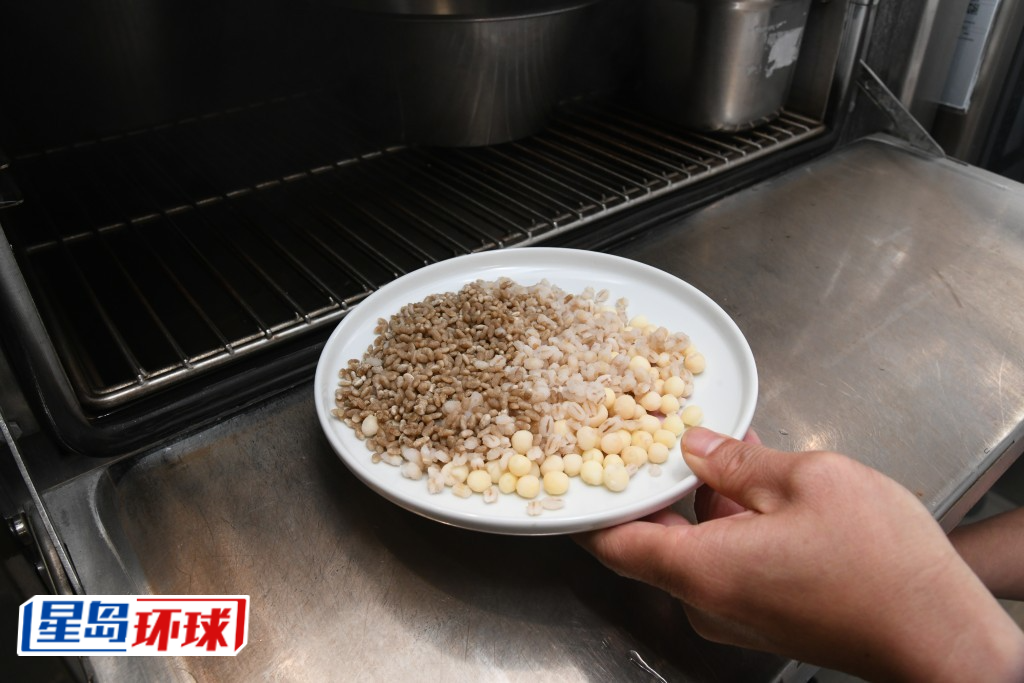 新鮮茨實、巖米及熟薏米一同浸泡30分鐘,蒸30分鐘。冬菇浸軟,蒸15分鐘后切粒。