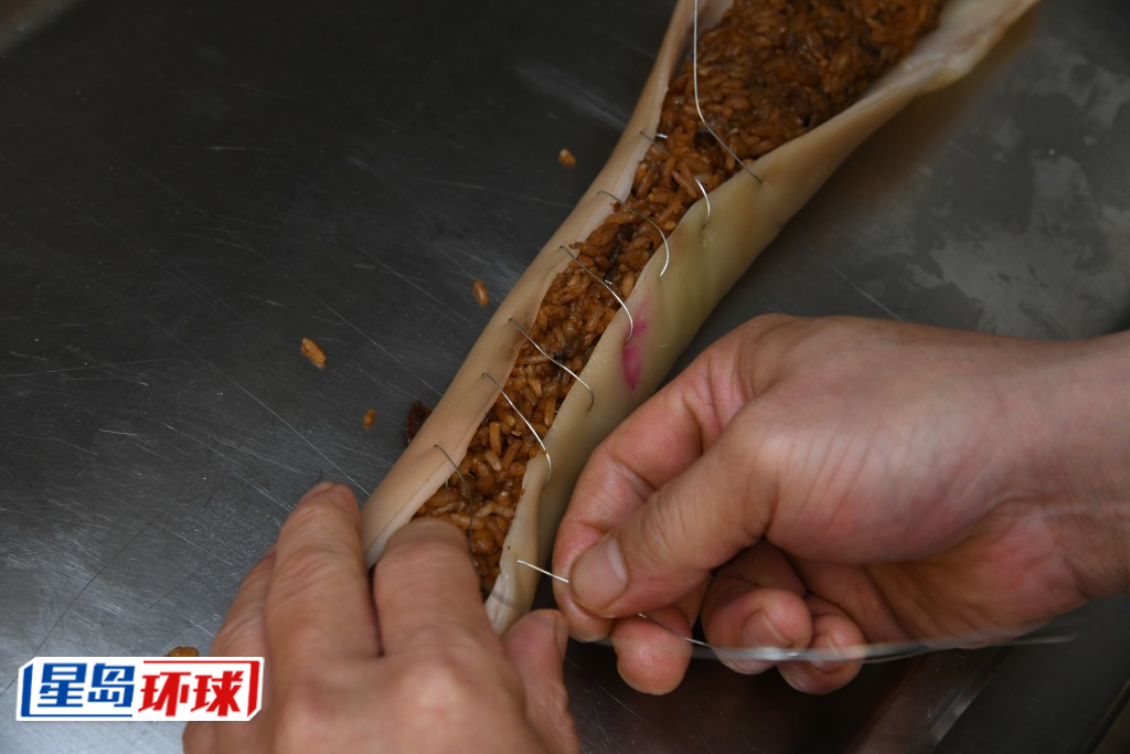 將餡料放在錫紙上定形,用乳豬皮(外皮向上)包裹餡料,用鐵線縫合。