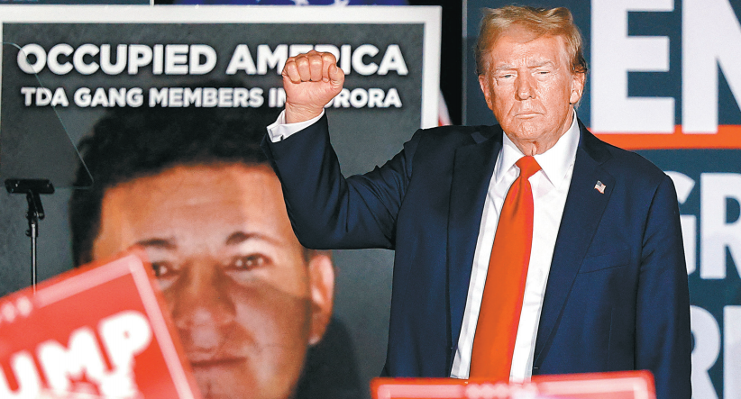 ▲特朗普在科州奧羅拉市競選集會上宣布,若重返白宮將援引1798年《外國敵人法》,推行“奧羅拉行動”嚴打非法移民犯罪集團。 路透社