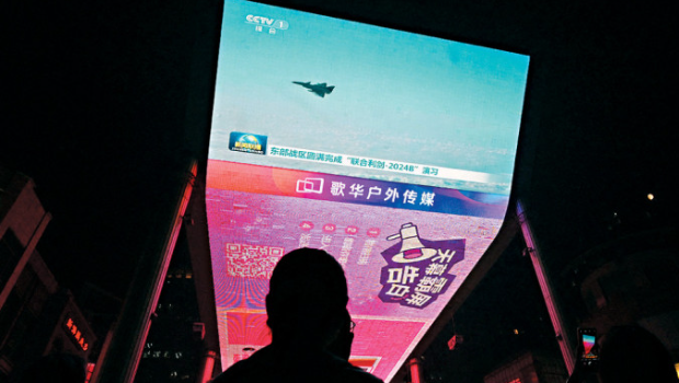▲北京市民駐足街頭,關心有關環臺軍演的消息。