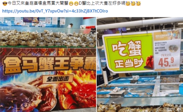▲日前有網民在facebook群組“深圳吃喝玩樂資訊關注組”上發文,分享在皇庭廣場盒馬購買大閘蟹的體驗