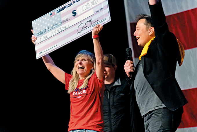 ▲馬斯克周日在匹茲堡把第2張100萬美元支票發給菲舍爾。