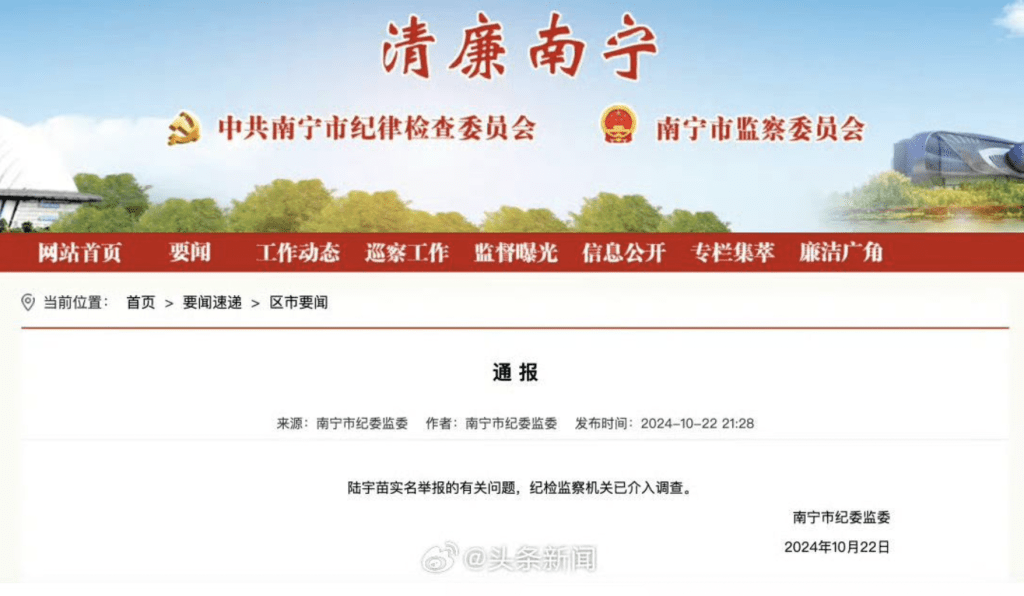 ▲南寧市紀委監委22日晚通報,陸宇苗實名舉報的有關問題,紀檢監察機關已介入調查。