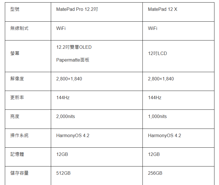 MatePad Pro 12.2” Vs. MatePad 12 X規格一覽:
