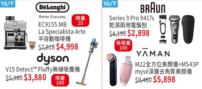 SOGO感謝祭每天都會推出不同精選優惠,首日以美容化妝為主,YSL、JO MALONE、SK-II等人氣品牌將推出皇牌護膚及香氛套裝,可以超抵價入手品牌熱賣產品。此外,LE CREUSET、Tefal、PHILIPS推出人氣鑄鐵鍋、鍋具、鬚刨等家庭電器限量優惠,當中Dyson V15 Detect fluffy版本吸塵機,由原價$5980減至$3880,足足有65折,數量有限,大家不要錯過!