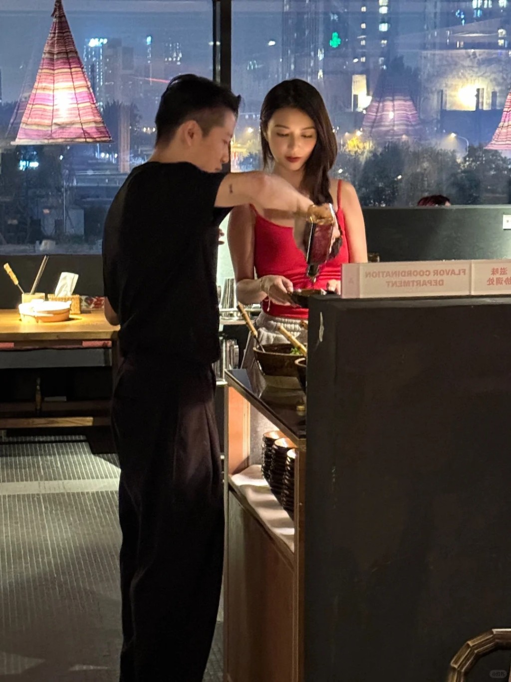 從多方圖片所見,薛凱琪與一名神秘黑衣男,在醬料區調配醬料,期間黑衣男溫柔地幫薛凱琪倒醬料,其后又一齊行回到座位。不過其實在相片中,薛凱琪這個飯局隨行者約有三至四名友人,不過黑衣男全程傍實薛凱琪,二人神態自然,難道薛凱琪北上發展后,事業愛情兩得意?