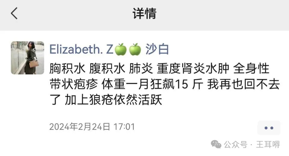 根據網友貼出的沙白朋友圈截圖可知,沙白今年2月發病,胸腹積水、肺炎、重度腎炎水腫、全身性帶狀皰疹,一月內體重飆升15斤。此次發病后,她向院方表示,拒絕使用激素、抗生素及一切補液,后果自負。