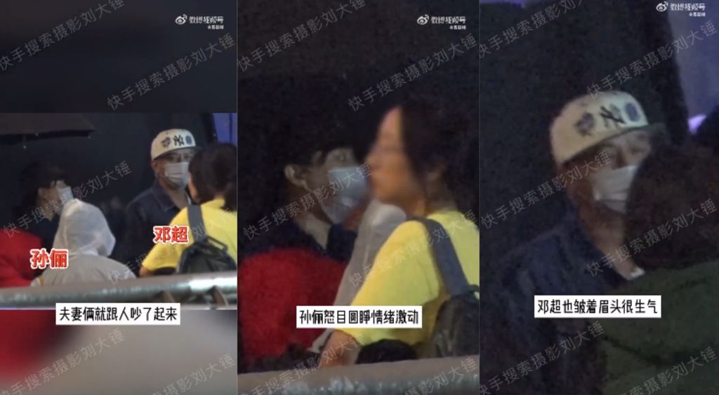 內地狗仔劉大錘釋出一段孫儷與鄧超在街邊與路人爭吵的影片,當中可見孫儷雖然戴著口罩及帽子,但仍可看得出她相當焦急,時而關注手機訊息、打電話,時而環顧四周,沒多久后她便帶著孩子一起去找鄧超。