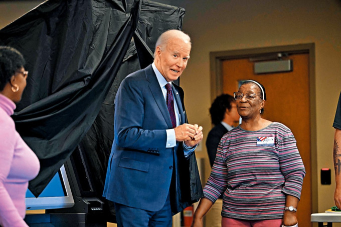 ▲美國總統拜登周一在家鄉特拉華州的一個票站,提早投票給哈里斯。