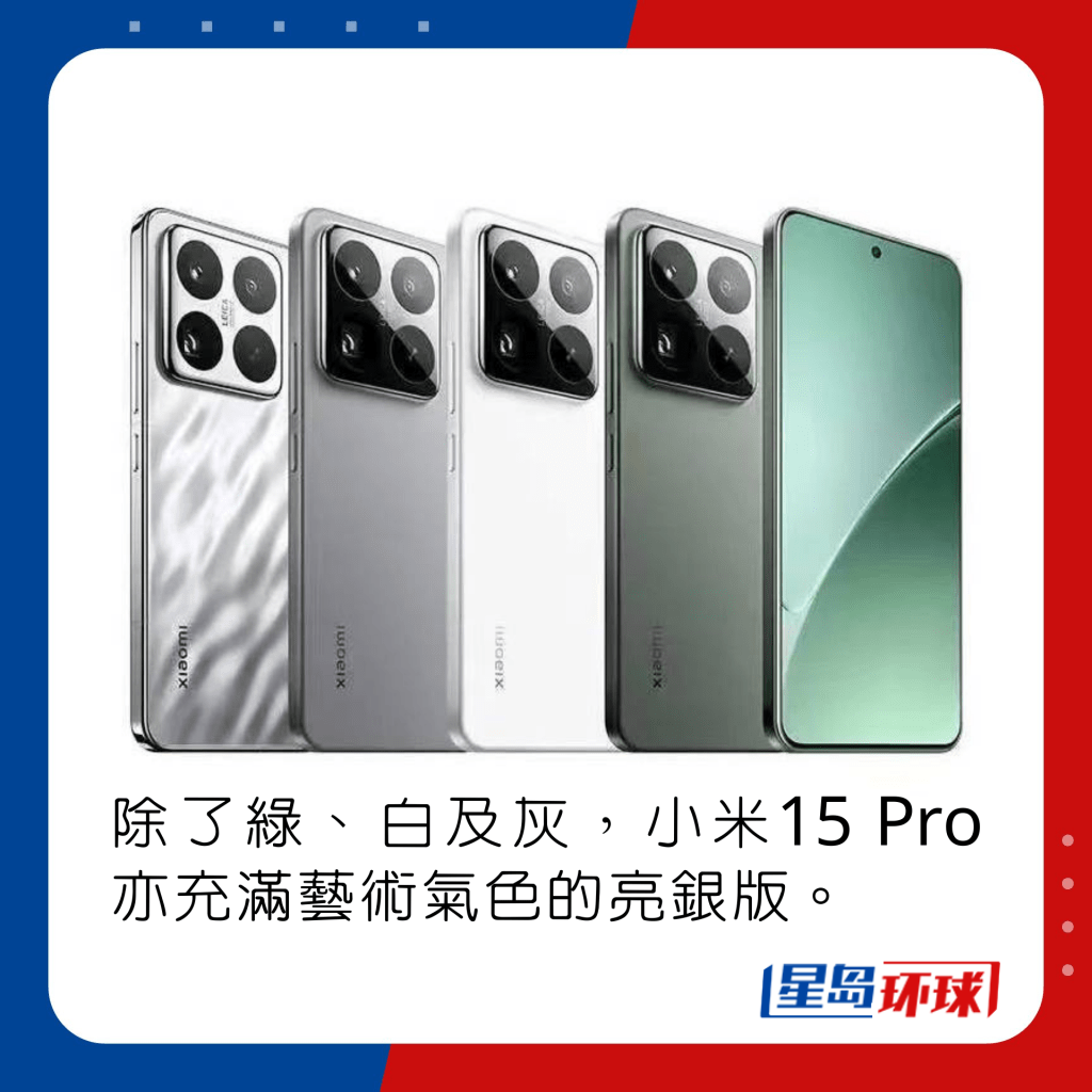 小米15 Pro熒幕也用上全新M9發光材料,6.73吋2K OLED芒為全等深微曲設計,邊框亦幼至1.38mm,表面鋪有小米龍晶玻璃2.0,為保持手感輕巧,重量減至213g,厚度薄至8.35mm,另避免出現近年常見的“頭重腳輕”情況,重量分配做到近乎50:50,機身亦備有亮銀版可選擇。