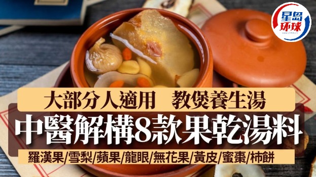 羅漢果、雪梨干、蘋果干、龍眼干、無花果、黃皮干、蜜棗及杮餅,都是常見干果湯料。注冊中醫林冠杰醫師指,踏入秋天不宜大量進補,他建議用這8款適合大部分人體質的果干做湯料,煲煮具滋潤補肺、養心健脾等功效的保健湯水。今日由林醫師講解這些果干的功效及宜忌,并有裕生海味負責人黃祺分享挑選及處理果干的小秘訣,讓大家懂得自煮時令湯水。