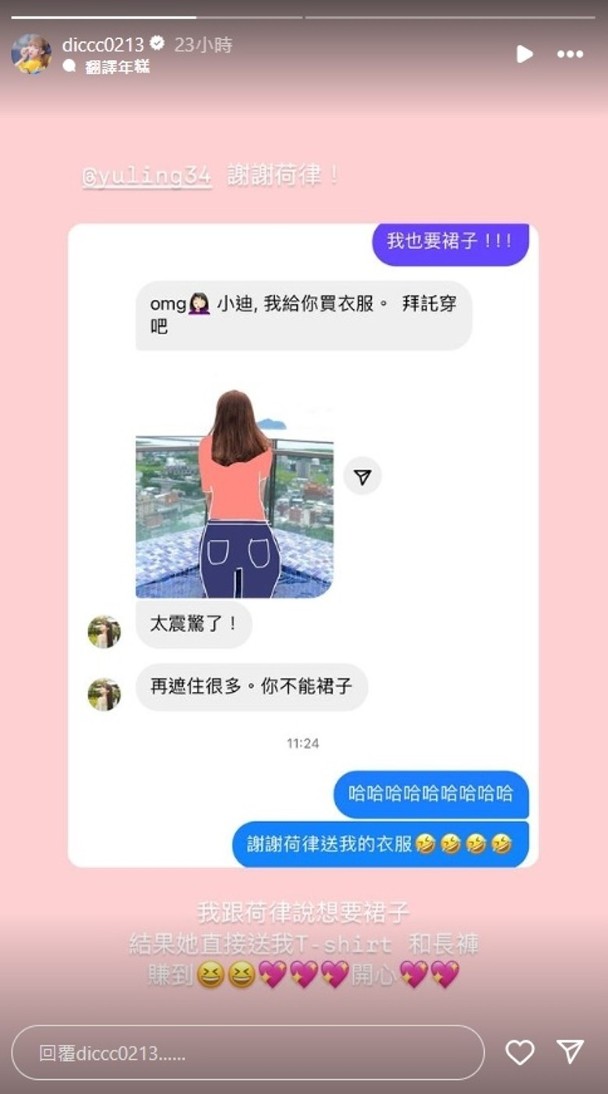 其后冼迪琦更曬出與隊友邊荷律對話,表示自己的大尺度水著相嚇親對方,當中邊荷律便驚呼:“omg小迪,我給你買衣服。 拜托穿吧”,隨后更幫冼迪琦畫上衫褲,說:“太震驚了! 再遮住很多。 你不能裙子”,二人互動引來網民爆笑,大贊冼迪琦身材一流。