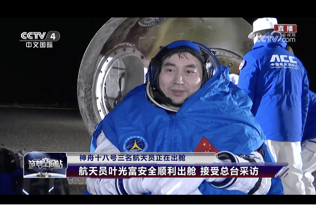 神舟十八號載人飛船返回艙,今日(4日)凌晨1時24分,在東風著陸場成功降落。神舟十八號載人宇宙飛船玤3名航天員葉光富、李聰、李廣蘇,已安全順利離開載人飛船,現場醫監醫護人員確認航天員葉光富、李聰、李廣蘇身體狀態良好,神舟十八號載人飛行任務取得圓滿成功。