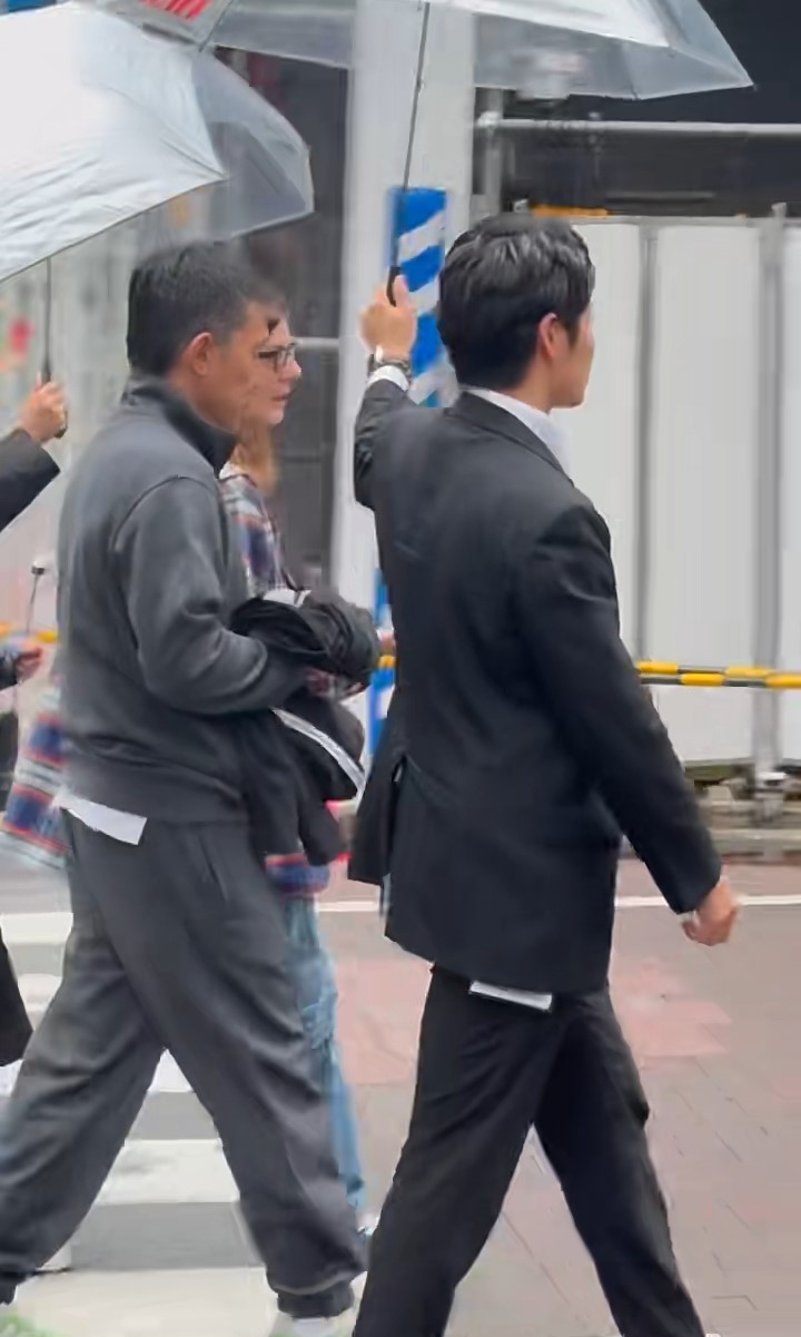 影片可見,梁朝偉一身灰色運動裝束,手揸一件黑色外套在銀座現身,他一行多人越過斑馬線慢步行。 當時天氣不穩,下著毛毛細雨,梁朝偉前面有一個穿黑色西裝疑似是保安的男士為他打傘,梁朝偉身旁及身后都有多名穿黑衣的工作人員同樣為他打傘,而梁朝偉則忙于跟身旁的外藉女子說話,如此大排場,絕對招徠途人目光。