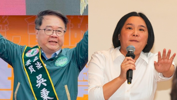 ▲陳玉珍(右)嗆看錄影帶求證,吳秉叡(左)竟惱羞成怒失控砸麥克風,遭酸綠色巨嬰。(合成圖)
