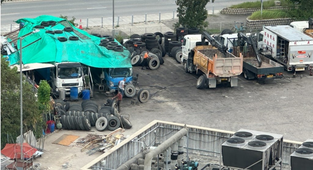被霸占表位用來做生意的停車場,分別位于將軍澳工業村駿昌街和駿宏街?!皡^區有申訴”記者日前到場視察,發現駿昌街停車場內,約有3檔非法經營的“修車檔”,為重型車輛修補車胎,同時兼營五金回收生意。每檔都霸占4至5個貨車表位,表位除了擺放維修工具和做生意外,更會架起帳蓬作臨時辦公室。而附近行人路和官地范圍,堆滿了一個個巨型車胎,十分夸張。而駿宏街停車場情況亦不遑多讓,同樣有3檔非法“修車檔”,每當他們搬動車胎時,都會導致塵土飛揚,加上地上滿是黑色油漬,現場一片污煙瘴氣。