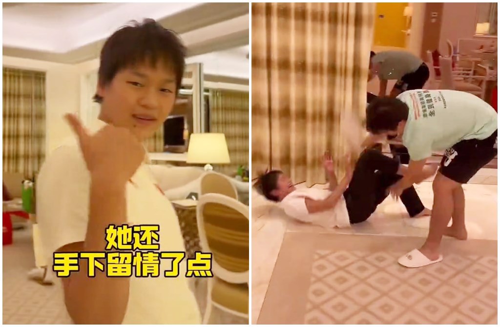 ▲全紅嬋假裝在師兄王宗源面前表演魔術,實際上卻是趁機掌摑。(圖/全紅嬋微博)