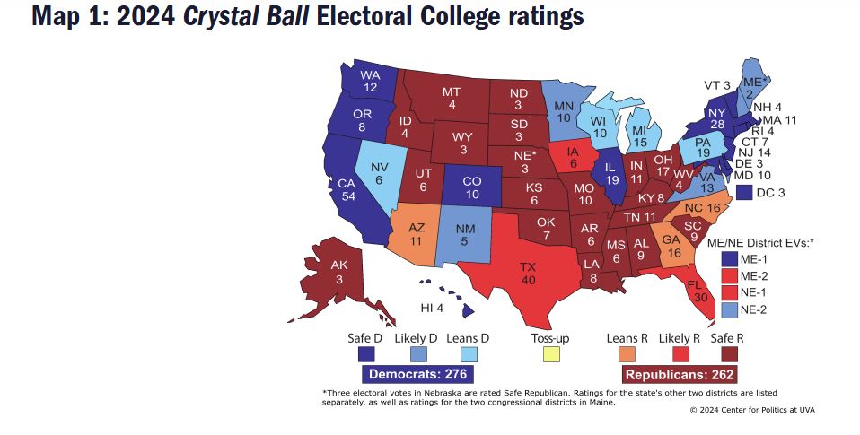 “薩巴托的水晶球”與“維吉尼亞大學政治研究中心”(University of Virginia Center for Politics)合作,薩巴托上周的預測仍未有明確的獲勝者,團隊直至今日才指出,哈里斯將贏得273張選舉人票,擊敗特朗普的262張,兩人間的差距極小。