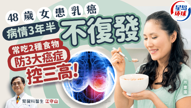 腎臟科醫生江守山在節目《健康好生活》中分享病例指,該名48歲女子罹患第3期“三陰性乳癌”,接受化療、電療和切除乳房手術后,有住院醫生告訴她,這種癌癥只有5年存活率,大約為10%,令她擔心無法陪伴孩子成長。該女子擔心可能會再復發,因而向醫生求助,詢問到底有沒有食物可以預防癌癥復發?