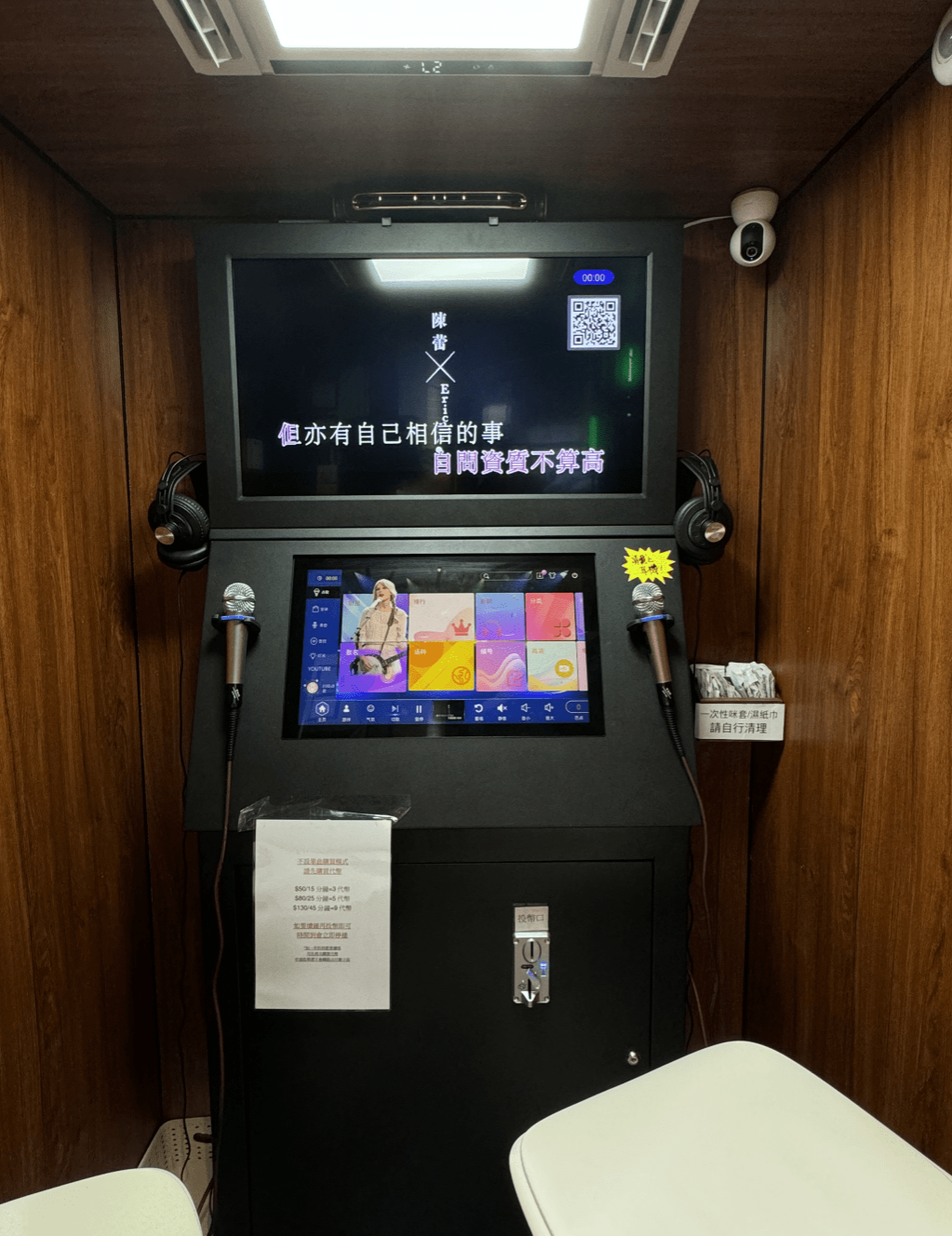 歌曲方面,自助唱K亭提供廣東、中、日、韓、英等多種流行歌曲目,更表示已全面購買歌曲版權,包括香港音像權有限公司PPSEAL、香港作曲家及作詞家協會CASH、香港華納唱片Warner Music Hong Kong Ltd.、英皇娛樂集團EEG等,確保所有歌曲均合法使用。亭內亦配備一次性咪套及獨立包裝濕紙巾、垃圾箱、儲物籃及掛勾等;另設手機支架,方便客人自行紀錄表現!