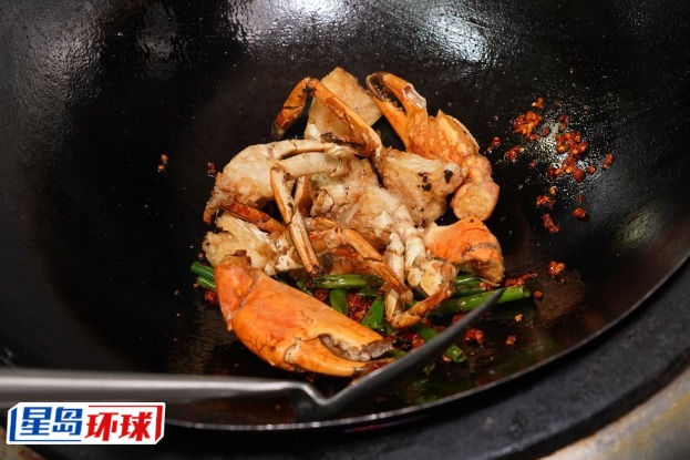 起油鍋爆香蔥段及辣椒,下蟹件炒勻。