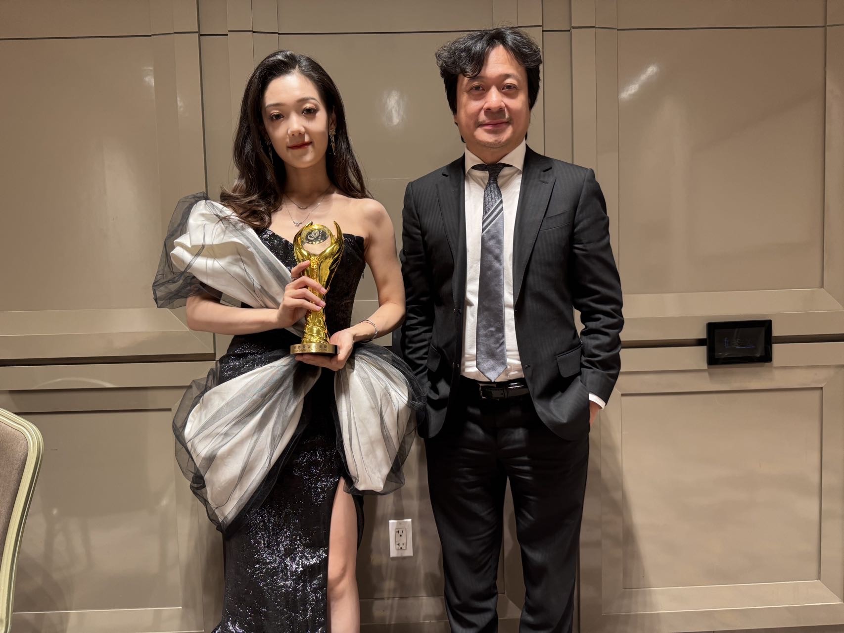 ▲得到中美電影節年度最佳作曲的舒楠(右),以及演唱主題曲《愛是唯一的選擇》希林娜依·高(左)。