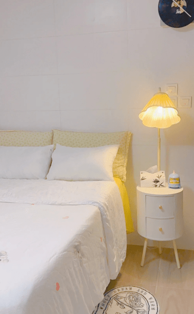 ▲在睡床旁邊放置一個小小的床頭柜,上面擺放花型床頭燈。