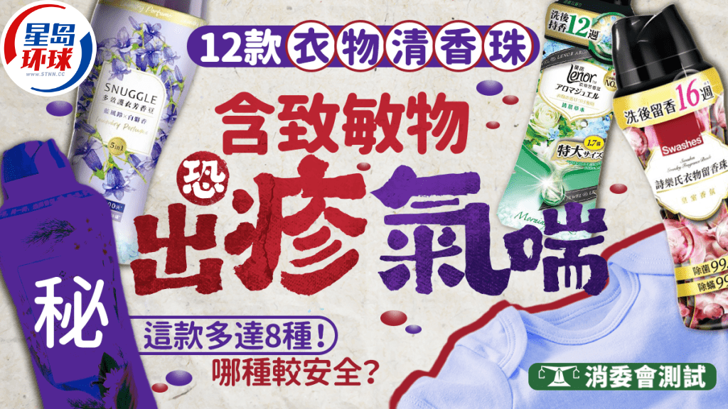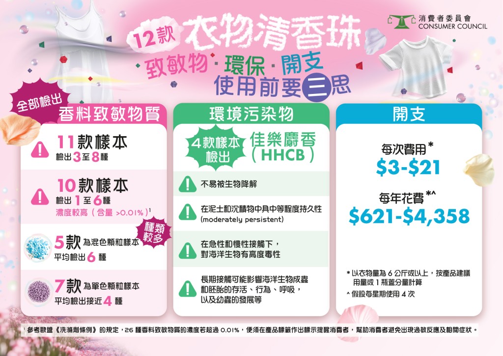 消費者委員會11月15日發表衣物清香珠檢測結果,測試市面12款衣物清香珠樣本,包括熊寶貝、柔麗(Softlan)、蘭諾(Lenor)、紡優美(ar Füm)等品牌,結果全部均檢出不同種類和濃度的香料致敏物質,最多1款更檢出共8種!另有4款樣本檢出不易被生物降解的人造麝香化合物佳樂麝香,長遠或對海洋生態造成影響。到底哪款較安全?