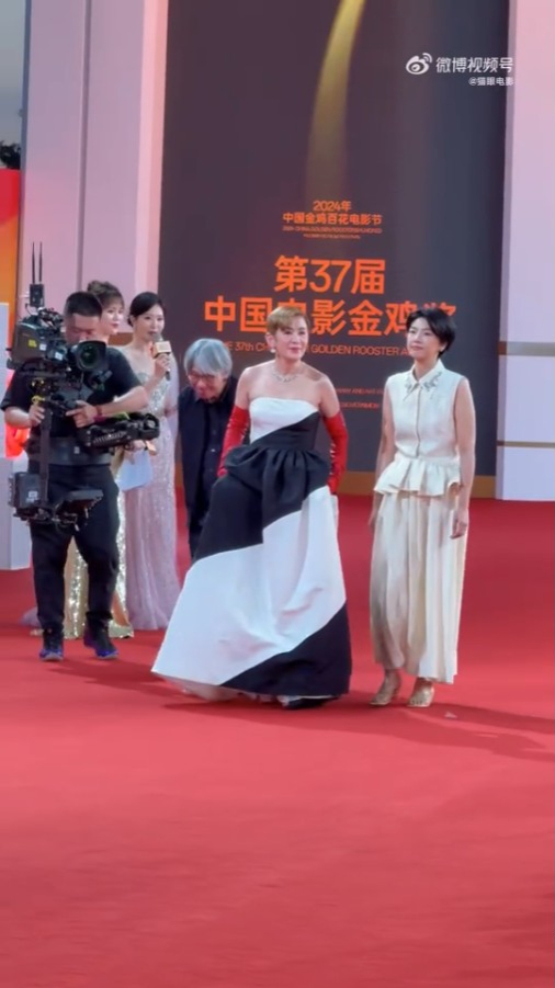 ▲而代表電影《我談的那場戀愛》劇組的吳君如就選擇了一身黑白相間拖地長裙,再戴上亮眼的紅色手套,整體造型既優雅又不失個性。