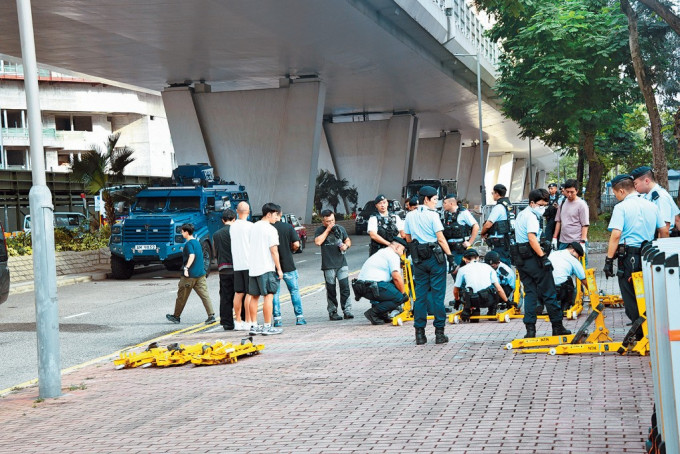 ▲多名穿上戰術背心的警員于法院對開行人路增設鐵欄和防止車輛沖擊的設備。