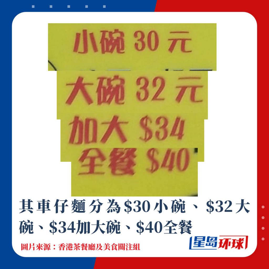 ▲其車仔面分為$30小碗、$32大碗、$34加大碗、$40全餐。