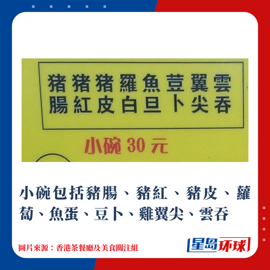 ▲小碗包括豬腸、豬紅、豬皮、蘿卜、魚蛋、豆卜、雞翼尖、云吞。