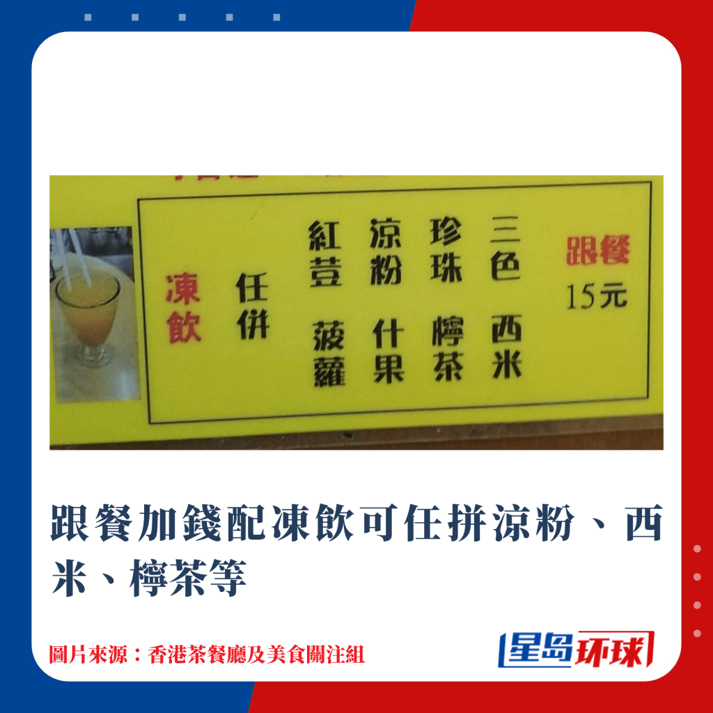 ▲跟餐加錢配凍飲可任拼涼粉、西米、檸茶等