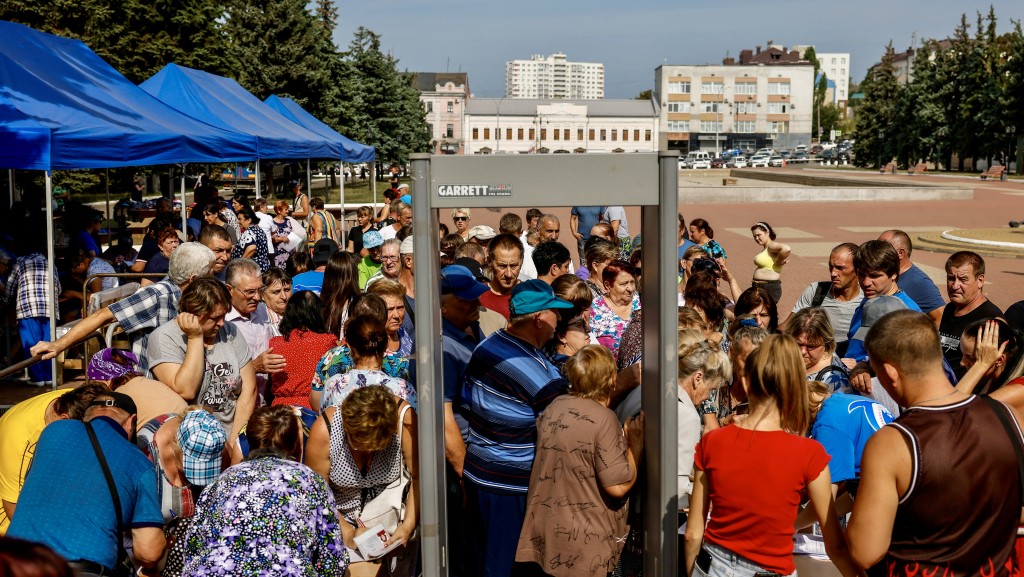 ▲從庫爾斯克地區撤離的居民在人道主義援助物資分發中心排隊。 路透社