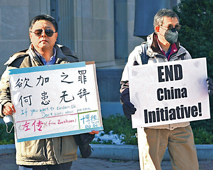 ▲華人在聯邦司法部大樓抗議“中國行動計劃”。