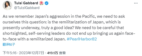 不過,此項提名引起日本的擔心。日媒的報道表示,在去年12月7日紀念日本偷襲珍珠港82周年之際,加巴德曾經發表過所謂“對日敵對言論”。當時她在X平臺發帖寫道:“當我們回憶日本在太平洋的侵略時,需要問自己一個問題:日本目前正在進行的新一輪軍事化進程,這真的是一個明智之舉嗎?”她還警告稱,美國應該對此保持小心謹慎的態度,以防“目光短淺、自私自利的領導人最終讓我們再次面對重新軍事化的日本”。