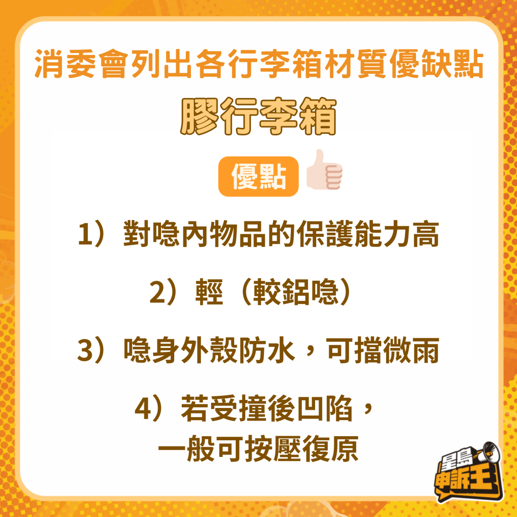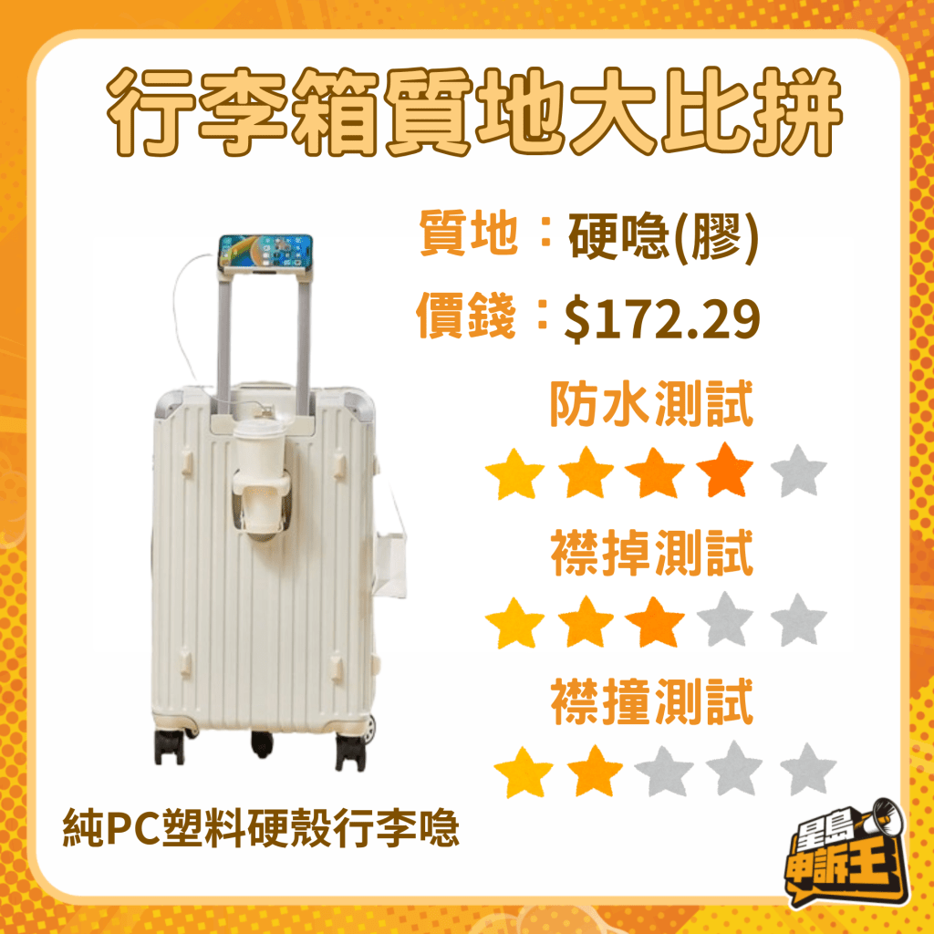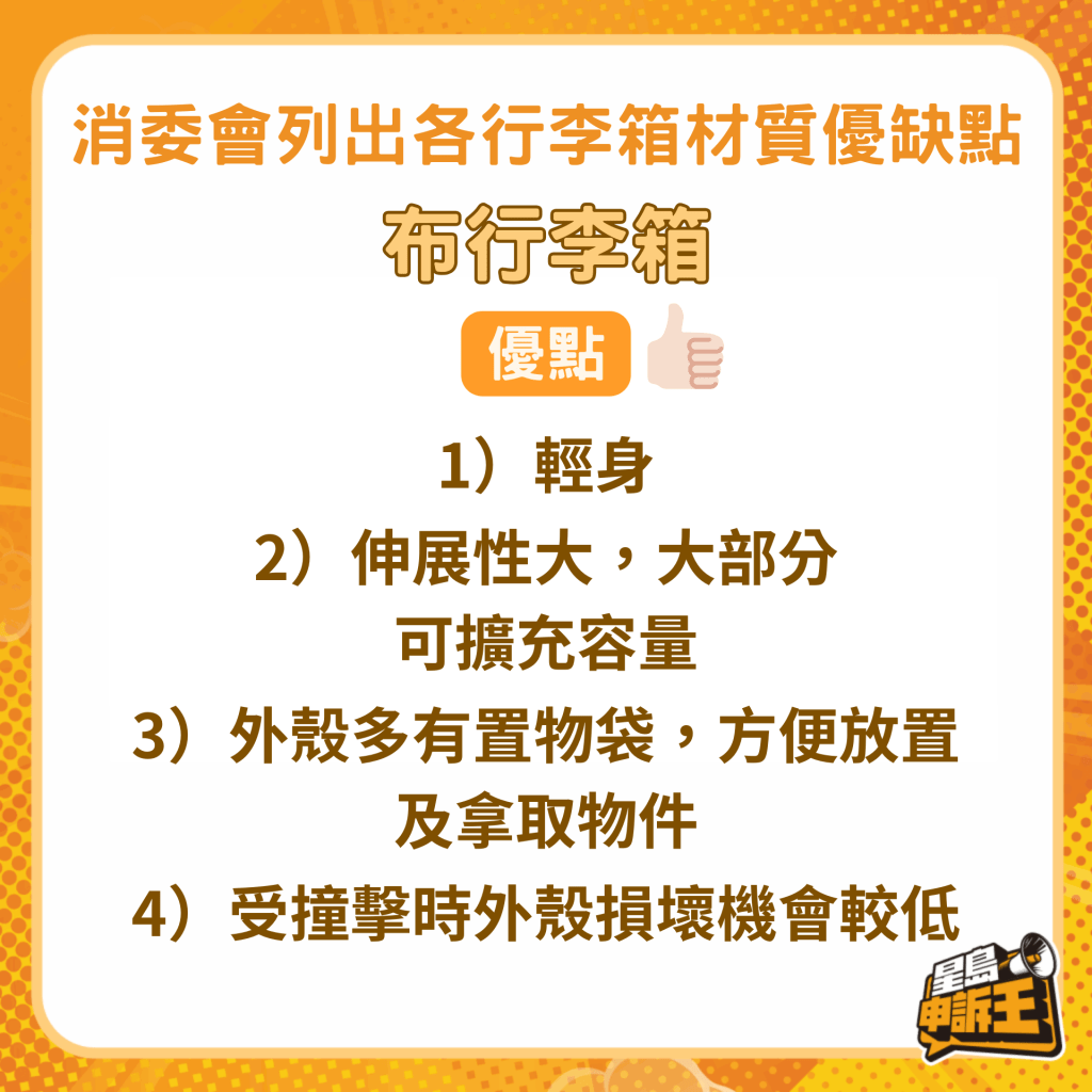 消委會回復《星島申訴王》指,按其去年的測試結果,以塑膠制造的硬行李箱耐跌撞能力較高,布行李箱則需留意其車線位造工,若造工不佳便會在跌撞或擠壓后有爆裂的風險。