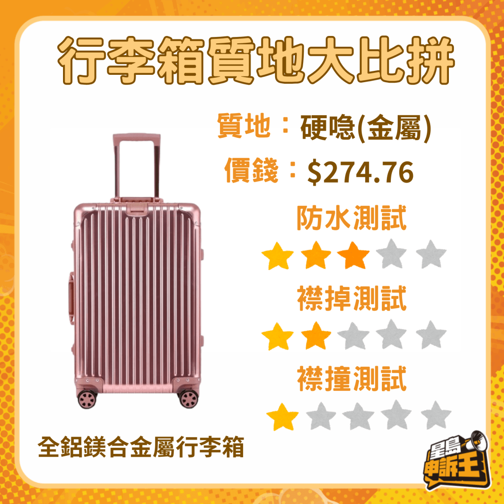 接下來測試襟撞程度,記者在樓梯上分別4級、8級、12級高的位置,將行李箱跌落地面。膠行李箱在測試過程中,隨住樓梯級數越高,花痕越明顯,亦有部份配件松脫;金屬行李箱則在12級跌下后四個角位全花,中間位置亦凹陷;而布行李箱則只有一個角位有輕微磨損及名牌松脫。
